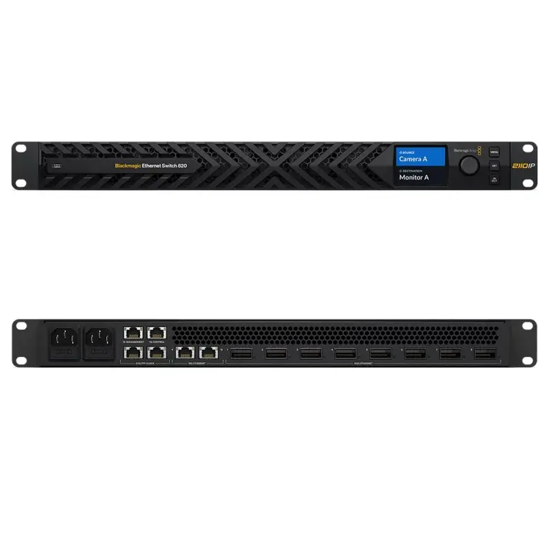 Der Blackmagic Ethernet Switch 820 besitzt acht 100G- und zwei 10G-Ethernet-Anschlüsse. Der leistungsstarke Switch bietet eine geringe Latenz, hat frontseitig verbaute Lüfter für einen geräuscharmen Betrieb und alle Anschlüsse auf der Rückseite angebracht.